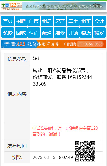 转让:阳光尚品售楼部旁,价格面议。联系电话15234433505