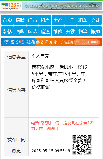 西花苑小区,后排小二楼125平米,带车库25平米。车库可租可住人只接受全款!价格面议