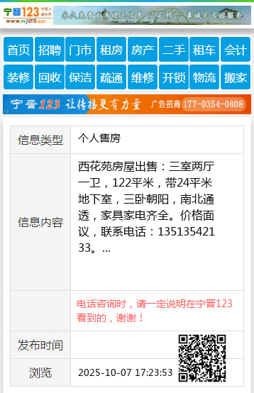 西花苑房屋出售:三室两厅一卫,122平米,带24平米地下室,三卧朝阳,南北通透,家具家电齐全。价格面议,联系电话:13513542133。 【电话咨询时,请一定说明在左权网看到的,谢谢!】 |