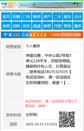 房屋出售,中央公园2号楼3单元128平米,顶楼带阁楼。精装修拎包入住,价格面议,联系电话18135323335 【电话咨询时,请一定说明在左权网看到的,谢谢!】 |