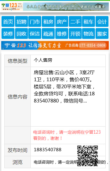 房屋出售:云山小区,3室2厅1卫,110平米 ,售价40万。楼层5层,带20平米地下室,全款房贷均可,联系电话:18835407880,微信同号