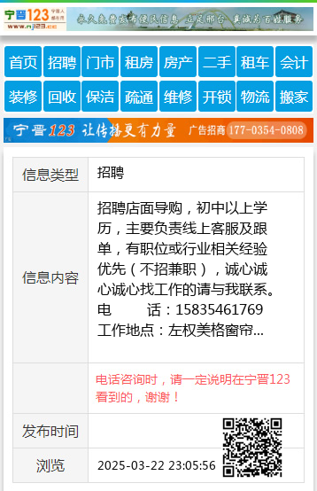 招聘店面导购,初中以上学历,主要负责线上客服及跟单,有职位或行业相关经验优先(不招兼职),诚心诚心诚心找工作的请与我联系。