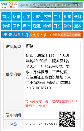 招聘:洗碗工1名,全天班,年龄40-50岁 。服务员1名,全天班,年龄20-40岁。