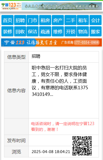 职中急招一名打扫大院的员工,男女不限,要求身体健康,有责任心的人,工资面议,有意愿的电话联系13753410149 【电话咨询时,请一定说明在左权网看到的,谢谢!】 |