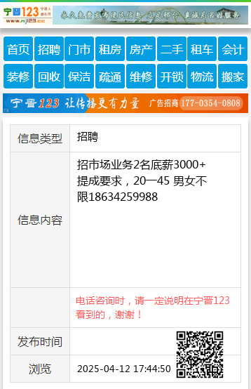 招市场业务2名 底薪3000+提成 要求,20一45 男女不限 18634259988