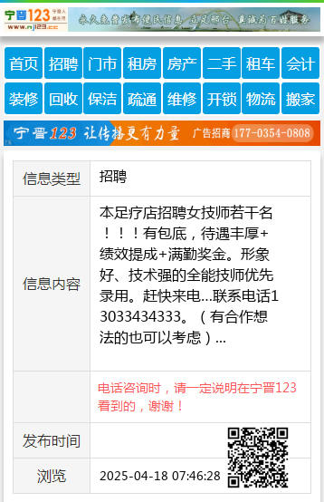 本足疗店招聘女技师若干名!!!有包底,待遇丰厚+绩效提成+满勤奖金。形象好、技术强的全能技师优先录用。赶快来电…联系电话13033434333。(有合作想法的也可以考虑) 【电话咨询时,请一定说明在左权网看到的,谢谢!】 |