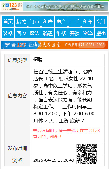 禧百汇线上生活超市,招聘店长 1 名,要求女性 22-40 岁,高中以上学历,形象气质佳,有责任心,有亲和力,语言表达能力强,能长期稳定工作。