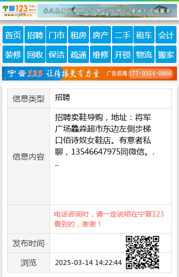 招聘卖鞋导购,地址:将军广场鱻淼超市东边左侧步梯口佰诗奴女鞋店。有意者私聊,13546647975同微信。