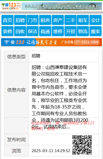 招聘:山西谦泰建设集团有限公司现招收工程技术员一名,包吃包住,工作地点为晋中市内各县市,要求会使用基本办公软件,必须会开车,刚毕业的工程类专业优先,年龄为18-35岁之间,工作期间有专业人员包教包会,待遇为试用期前3月2000元。试用结束后,根据业务水平工资再谈 【电话咨询时,请一定说明在左权网看到的,谢谢!】 |