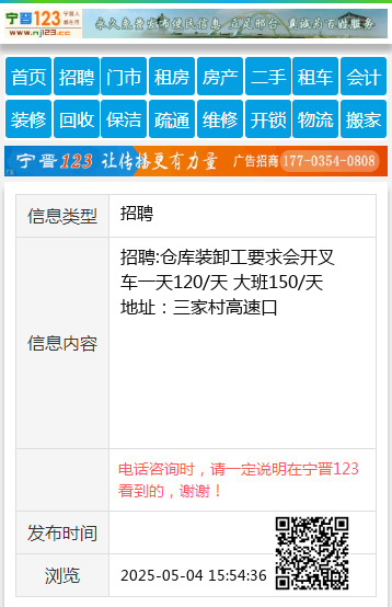 招聘:仓库装卸工 要求会开叉车 一天120/天 大班150/天 地址:三家村高速口