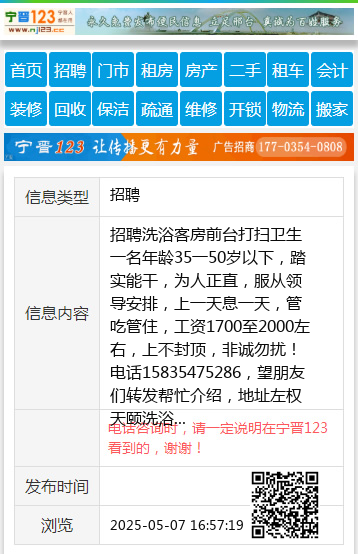招聘洗浴客房前台打扫卫生一名年龄35一50岁以下,踏实能干,为人正直,服从领导安排,上一天息一天,管吃管住,工资1700至2000左右,上不封顶,非诚勿扰!电话15835475286,望朋友们转发帮忙介绍