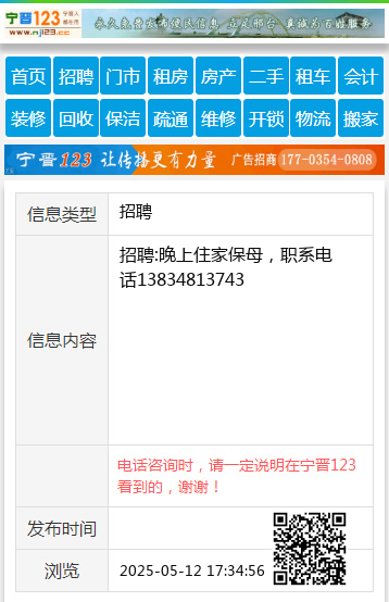 招聘:晚上住家保母,职系电话13834813743