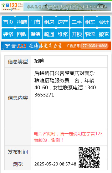 后峪路口兴客隆商店对面杂粮馆招聘服务员一名,年龄40-60,女性联系电话 13403653271