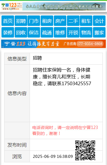 招聘住家保姆一名,身体健康,擅长育儿和烹饪,长期稳定,请联系17503425557
