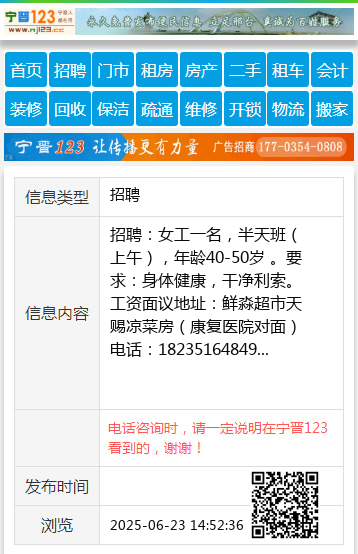 招聘:女工一名,半天班(上午),年龄40-50岁 。