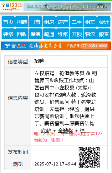 电话联系:13233447708 (微信同号,添加时请备注“应聘轮滑教练/销售”) 【电话咨询时,请一定说明在左权网看到的,谢谢!】 |