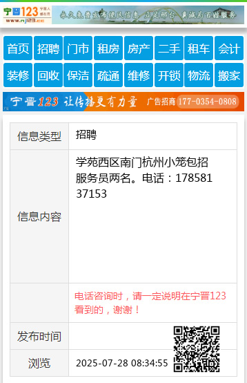 学苑西区南门杭州小笼包招服务员两名。 电话:17858137153