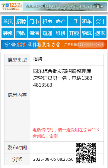 同乐综合批发部招聘整理库房管理员男一名,电话13834813563