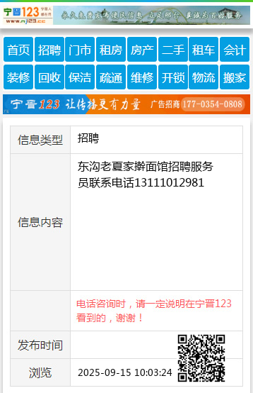 东沟老夏家擀面馆招聘服务员联系电话13111012981