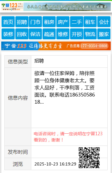欲请一位住家保姆,陪伴照顾一位身体健康老太太。要求人品好,干净利落,工资面谈。联系电话18635058618