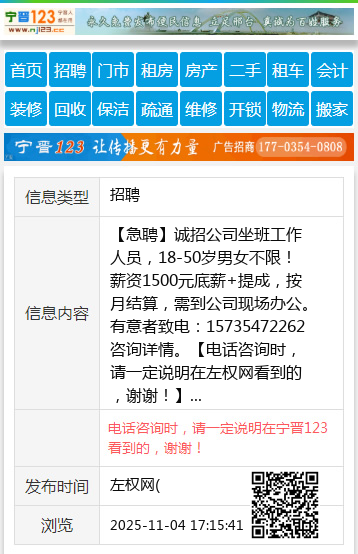【急聘】诚招公司坐班工作人员,18-50岁男女不限!薪资1500元底薪+提成,按月结算,需到公司现场办公。有意者致电:15735472262 咨询详情。 【电话咨询时,请一定说明在左权网看到的,谢谢!】 |