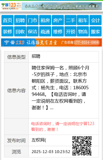 聘住家保姆一名,照顾6个月-5岁的孩子,地点:北京市朝阳区,薪资面议。联系方式:杨先生,电话:18600594468。 【电话咨询时,请一定说明在左权网看到的,谢谢!】 |