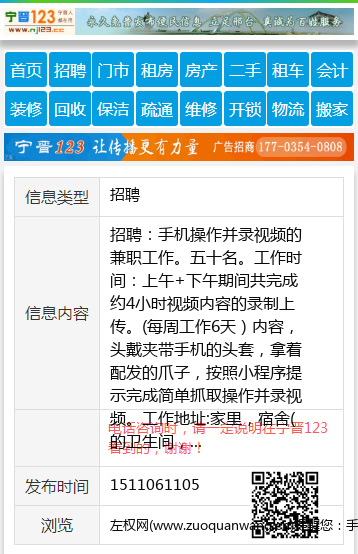 招聘:手机操作并录视频的兼职工作。五十名。 工作时间:上午+下午期间共完成约4小时视频内容的录制上传。(每周工作6天) 内容,头戴夹带手机的头套,拿着配发的爪子,按照小程序提示完成简单抓取操作并录视频。 工作地址:家里,宿舍(的卫生间,厨房,客厅,卧室,阳台等)项目可以持续1年。 年龄要求:40岁以下,女士优先 费用:90元/人天现金 有想法请联系15110611055,有人教