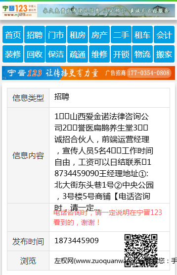1️⃣山西爱金诺法律咨询公司 2️⃣誉医扁鹊养生堂 3️⃣诚招合伙人,前端运营经理,宣传人员5名 4️⃣工作时间自由,工资可以日结 联系☎18734459090王经理 地址①:北大街东头巷1号 ②中央公园,3号楼5号商铺